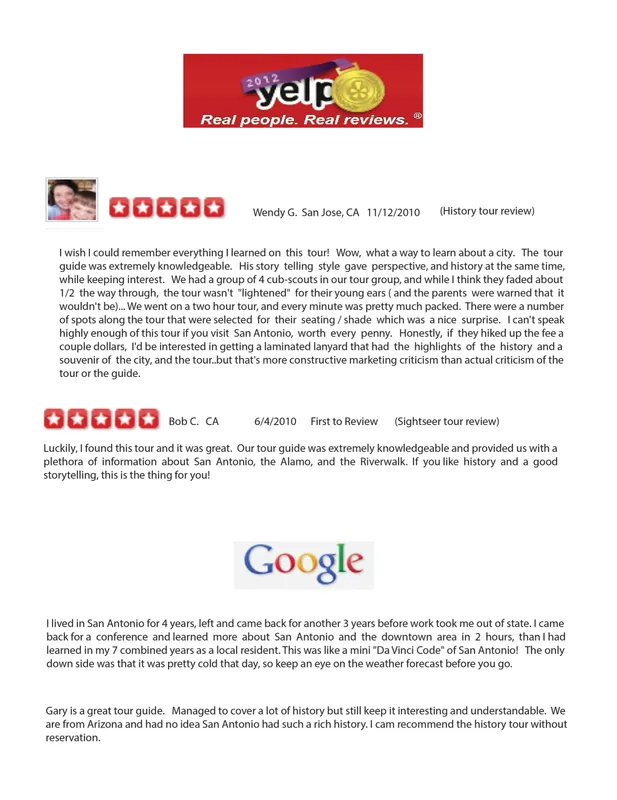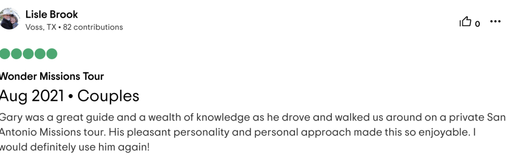 We took two of Gary’s tours. The King William historical tour and the history of San Antonio tour (which includes the Alamo). Gary, the tour guide, has incredible knowledge and enthusiasm for the area. His presentation was exceptionally interesting and fact filled. He showed the big picture; how events happening around the world affected the events that happened in San Antonio. We discovered how the Alamo shaped the overall history of Texas. You will walk away with a whole new perspective of Texas history. We so very much recommend Gary’s “walks”. He makes it fun and educational at the same time!!!! Thanks Gary.